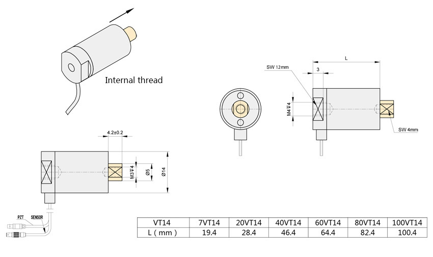 VT series actuators are compact and easy to integrate. The special mechanical structure design optimizes its load, stroke, dynamics and overall dimensions. The diameter is divided into 14mm, and the blocking force is up to 1200N, the max displacement is up to 95μm.