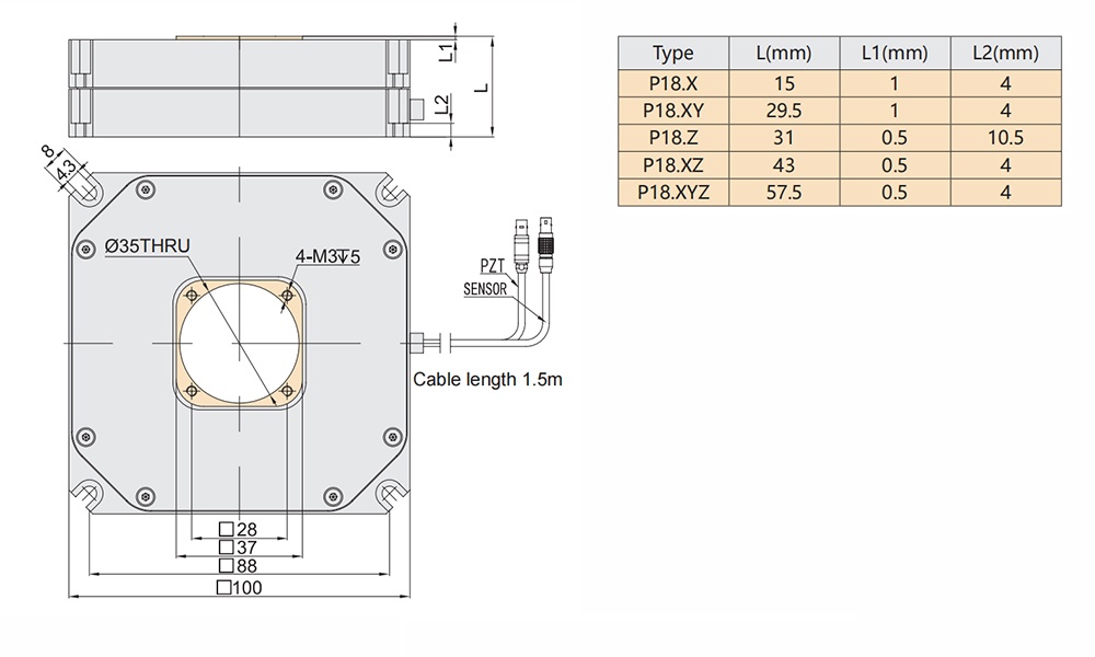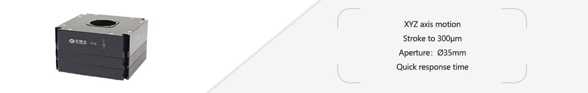 P18.XY300Z200 is XYZ axes motion piezo linear scanner. It adopts amplified mechanism and built-in high-reliability piezo actuators, which could realize high-speed scanning up to 300μm. The aperture is Ø35mm, and various displacement strokes and specifications are available for selection. It is suitable for large-travel multi-dimensional scanning applications.